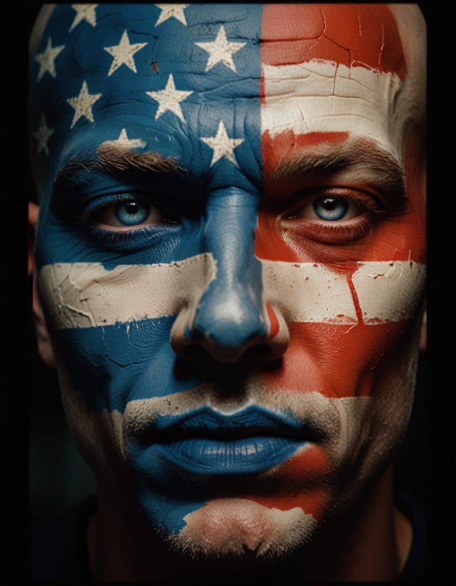 This image shows a close-up of a bald man's face painted with flag patterns. The cinematic shot features vibrant colors, rough skin texture, and golden light, enhanced with film grain and deep shadows.