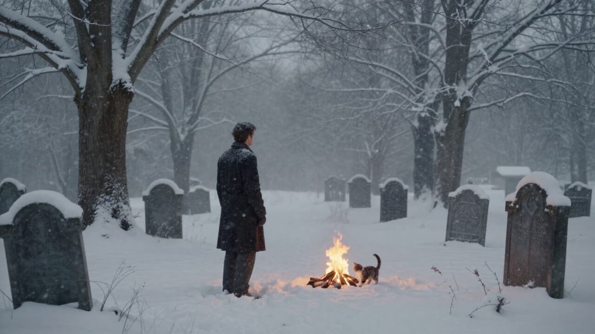 This image depicts a stark 1800s graveyard transformed into a snowy wonderland by a gentle blizzard. A solitary figure stands silhouetted against snow-covered trees, a small fire casting a warm glow nearby, with a kitten playing. Rendered in a hyperrealistic, painterly style with dramatic lighting.