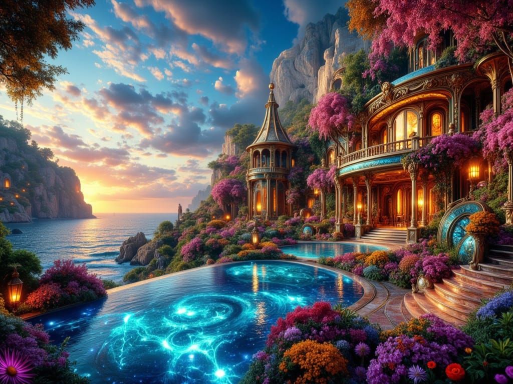 This image showcases an extravagant, multicolored Italian villa in a lush, futuristic Shangri-La. Bioluminescent flora and flowing architecture blend nature and technology in golden hour light.