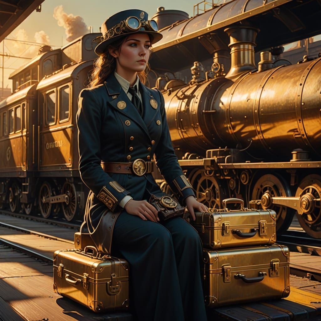 A medium shot of a woman with a suitcase waiting on a train platform. Golden light illuminates brass gears, with steam rising in the background in a steampunk aesthetic.