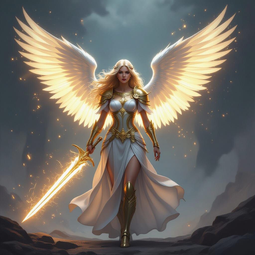 This image depicts an archangel holding a radiant sword infused with golden energy and a bright white aura, symbolizing divine power and protection.
