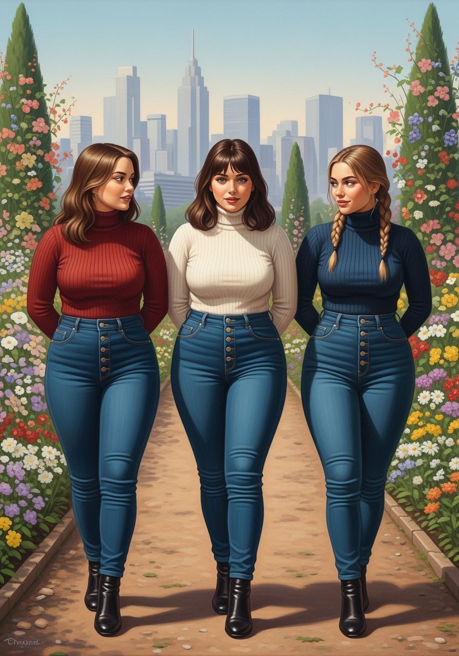 This image shows three curvy Swedish friends in a botanic garden, painted in a style reminiscent of Pre-Raphaelite and contemporary figurative art. They face the viewer with hands behind their backs, with a city skyline symbolizing friendship in the background.
