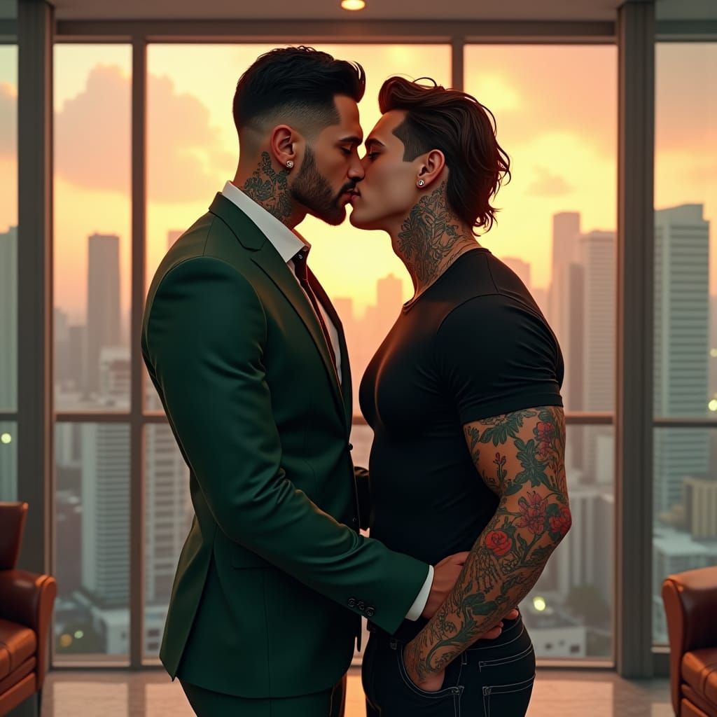 A striking picture of two tattooed men embracing and kissing in a luxurious Miami office. The scene is bathed in a warm, romantic golden glow, with a matte painting style and deep, rich colors as 8k digital art.