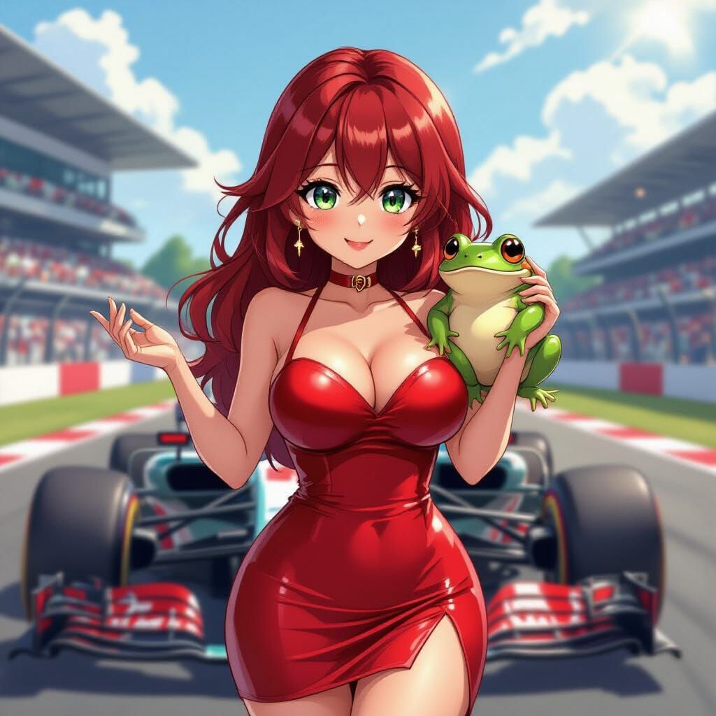 A cel-shaded anime woman with crimson hair and green eyes smiles, holding a frog in front of a Formula 1 car. The image features cinematic lighting and deep colors, reminiscent of Studio Trigger's style.