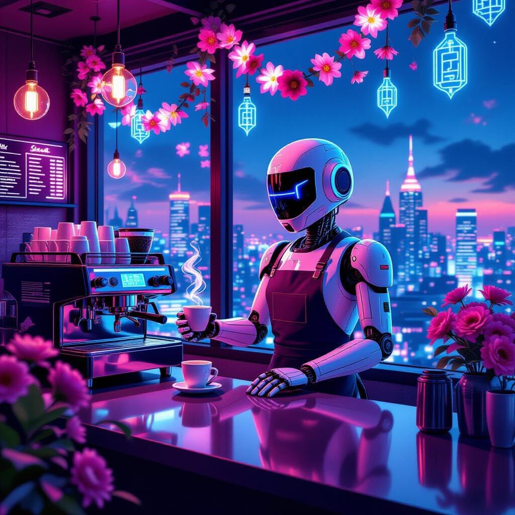 This image shows a rooftop cyberpunk cafe with neon lights and holographic plants. A robot barista wearing an apron serves coffee with a futuristic digital art aesthetic.