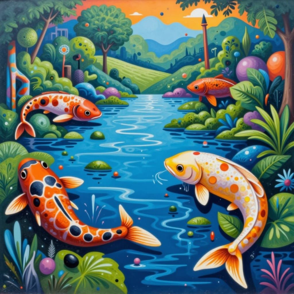 This image depicts a serene koi pond teeming with colorful fish. The scene is rendered with a vibrant color palette and artistic flair.