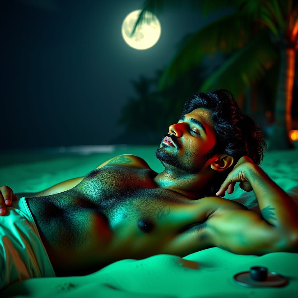 This image shows a handsome Indian man sleeping on a tropical beach under the moonlight. The portrait features a dark, neon green glow and bokeh in a color portrait style with sharp focus.
