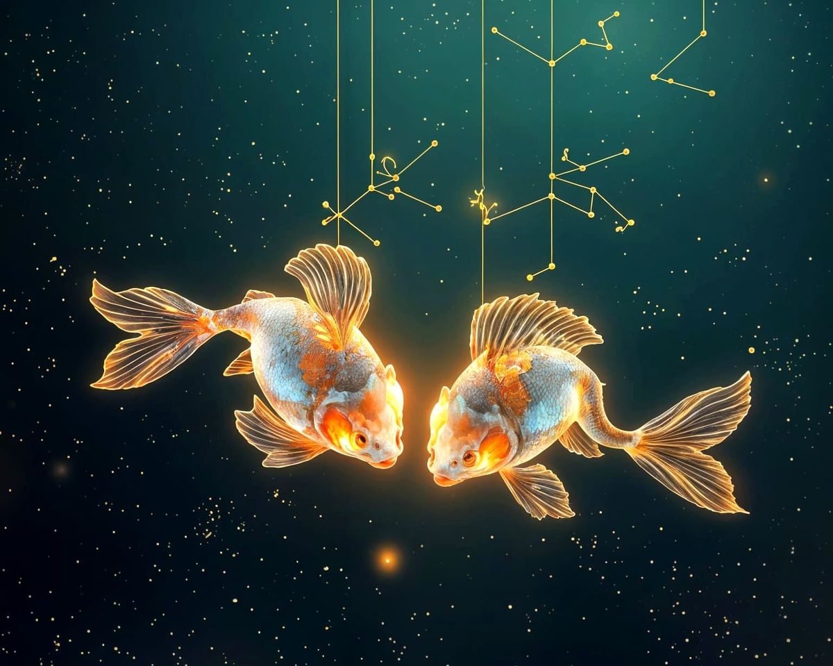 magnificent fantastical 3D fractal in the style of M. C. Escher carne griffiths victo ngai! multimedia art of 2 flying glowing koi fish as pisces constellation! yin yang pisces circling! 8k resolution concept art art deco art nouveau magnificent masterpiece of intricate detailed floating pisces
