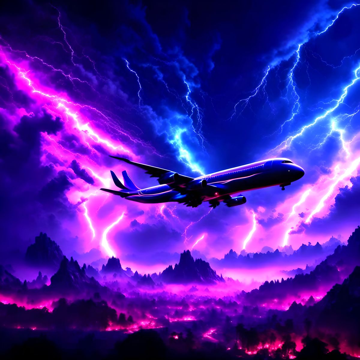 This image shows an airplane soaring through a stormy sky illuminated by intense lightning. Purple fog and dark blue mist create a gloomy atmosphere, enhanced by dark, smoky backgrounds.