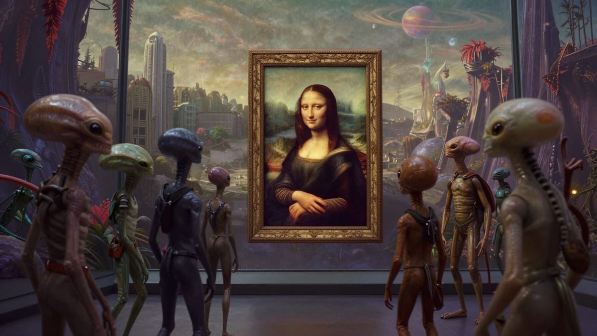 This photorealistic image captures diverse aliens in a glass museum on an exotic planet, viewing the Mona Lisa. The scene outside features an alien city with unique flora under a crepuscular sky.