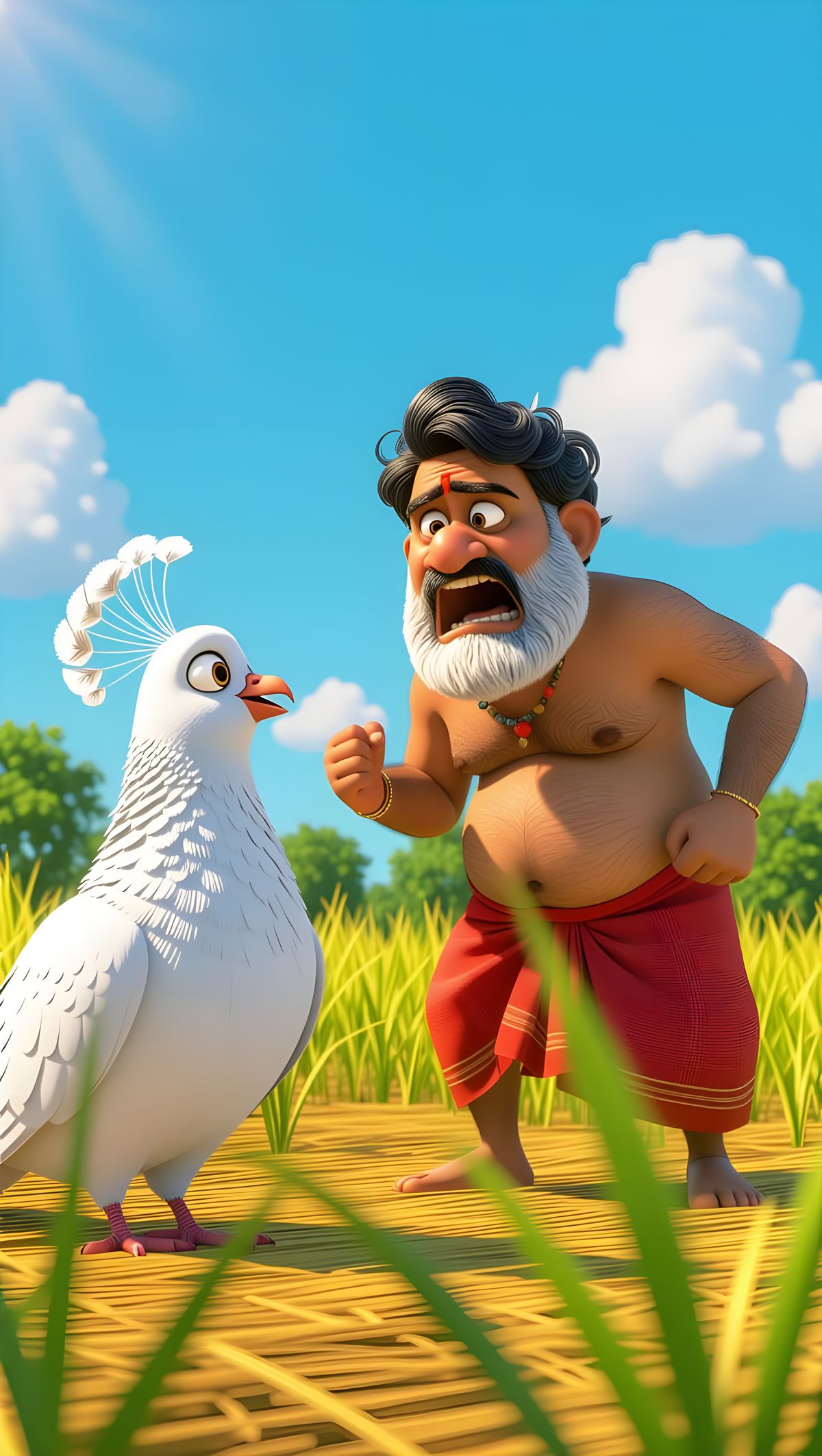 This image shows a vibrant, 3D-realistic scene of a giant Indian farmer shouting at a terrified pigeon in a lush green field under a bright blue sky. The farmer is dressed in a colorful dhoti and gamcha, while the pigeon trembles with fear.
