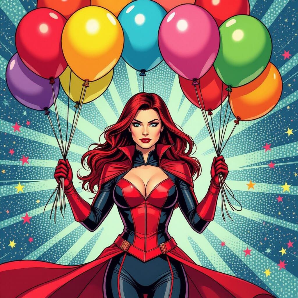 A digital painting of Scarlet Witch in a superhero costume holding birthday balloons. The image is in a comic book style, with bold lines, intricate details, and vibrant colors.