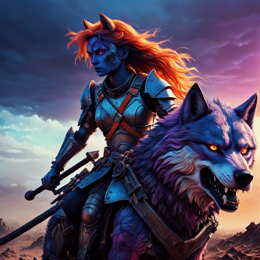 A striking picture of a female warrior riding an armored wolf through a wasteland. The wolf's armor is rusty and worn, with glowing blue lines on the axe, and vibrant colors in a heavy metal art style.