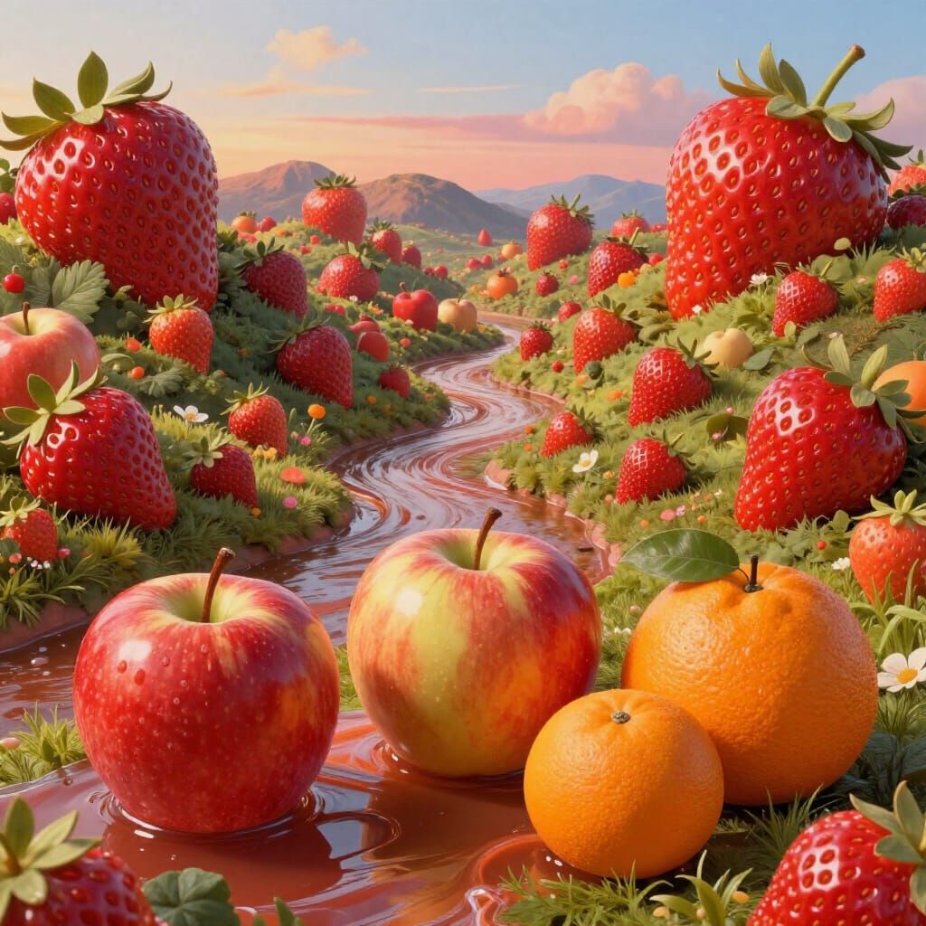 This image shows a fantastical landscape made of giant fruits, with a juice river and detailed apples and oranges. It's rendered in a vibrant, hyperrealistic surrealist style with warm afternoon light.