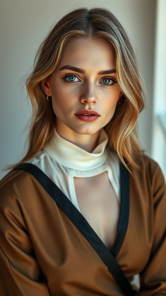 A striking portrait of a young Caucasian woman with pale skin and large eyes. The subject is wearing elegant clothing and is photographed in a brightly lit studio, with a cinematic aesthetic.