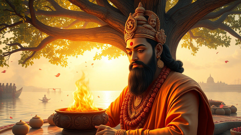 A vivid image shows the Hindu god Brahma performing a Yagya ritual beneath a large tree. The hyperrealistic scene is bathed in golden light and rendered in jewel tones as splash art.