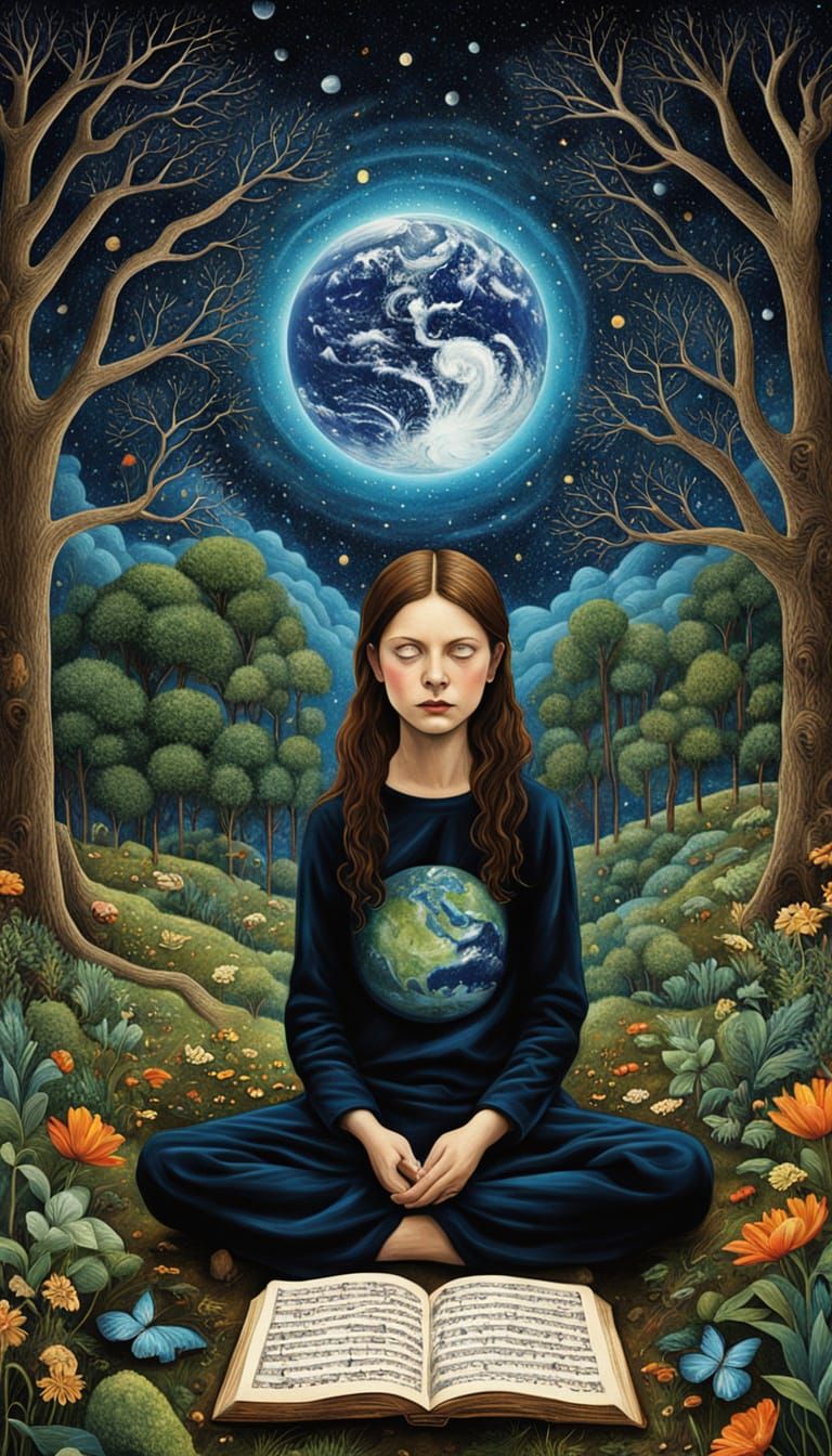 This digital artwork is a vibrant, otherworldly collage of Bio Art, blending elements of nature, abstract designs, and a textured music network. The central figure, symbolizing strength and resilience, is surrounded by serene landscapes and intricate patterns, encouraging the viewer to seek authenticity ...