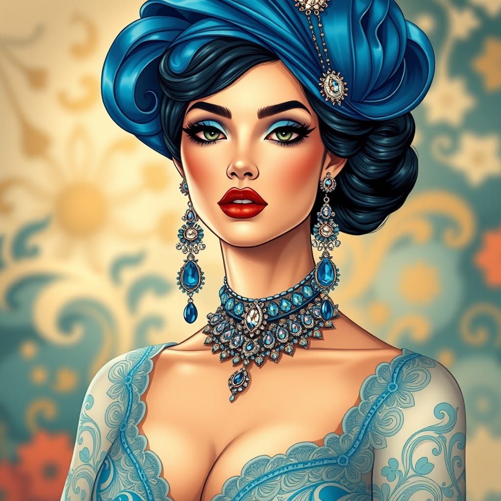 A stunning woman in elaborate blue and white attire poses regally. Her jewelry sparkles against a softly blurred backdrop in an art nouveau style.