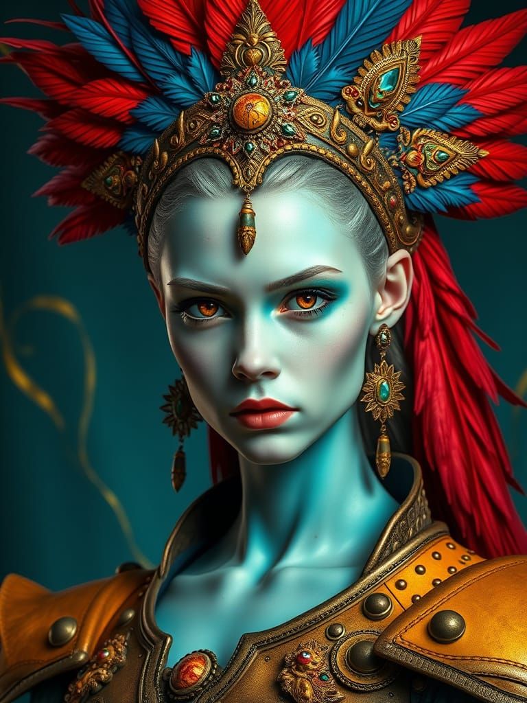 A striking picture of a turquoise-skinned woman wearing an ornate headdress and mustard jacket. The image blends fantasy and classical mythology elements in a highly detailed, sculptural style.