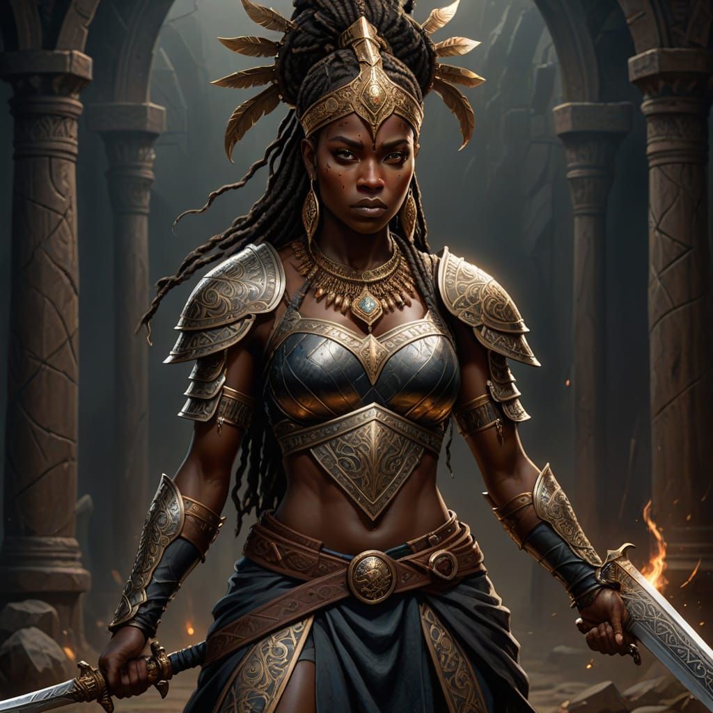 A highly detailed digital painting of a powerful, dark-skinned female warrior in medieval fantasy armor, adorned with intricate designs and tribal jewelry, set against a dark background with vibrant, brown tones and golden accents.