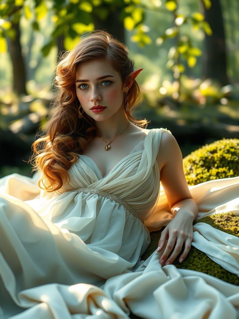 This photorealistic image shows a serene elven maiden with copper curls resting on moss and silk in a sunlit forest. Morning light creates a dreamy, soft-focus effect with hyperdetailed textures.
