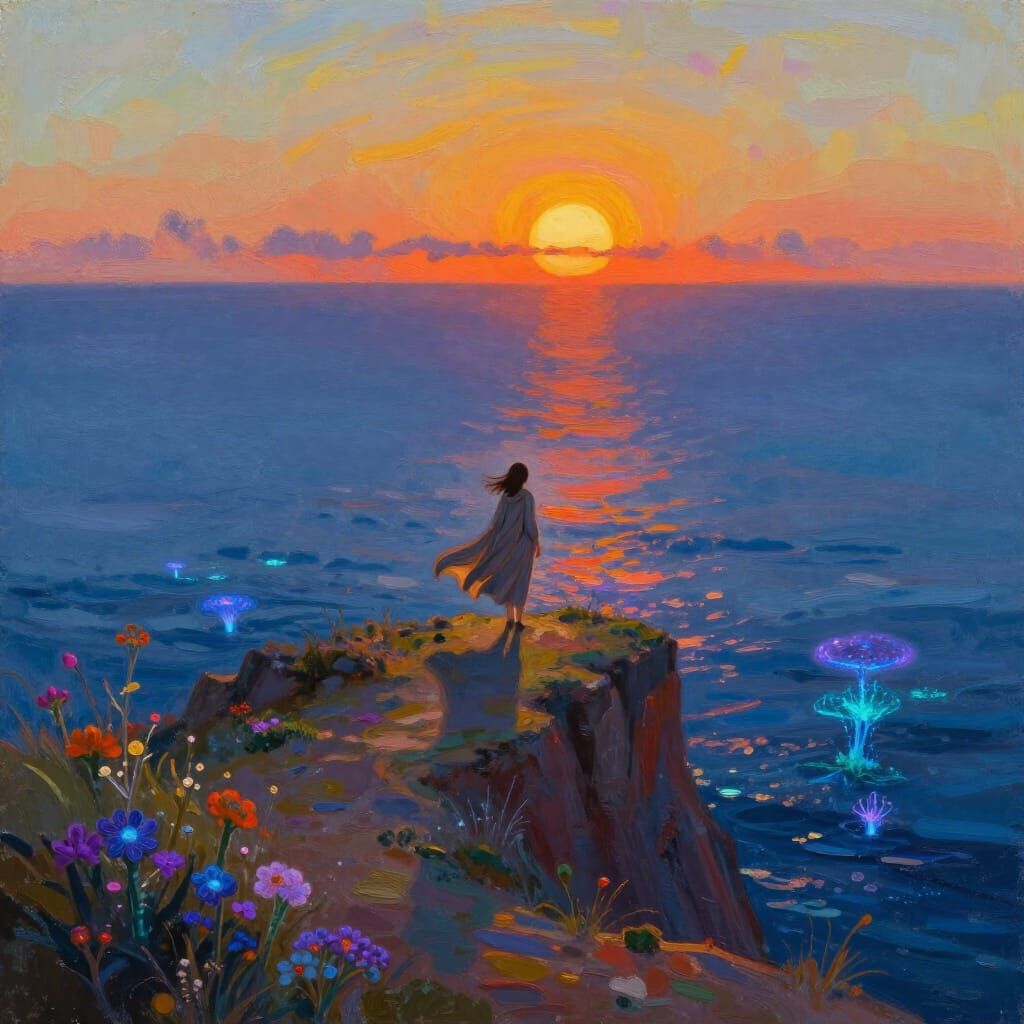 This image shows a lone figure on a cliff above a glowing alien sea as two suns dip below the horizon, creating ethereal shadows. Rendered in a vibrant, painterly style.