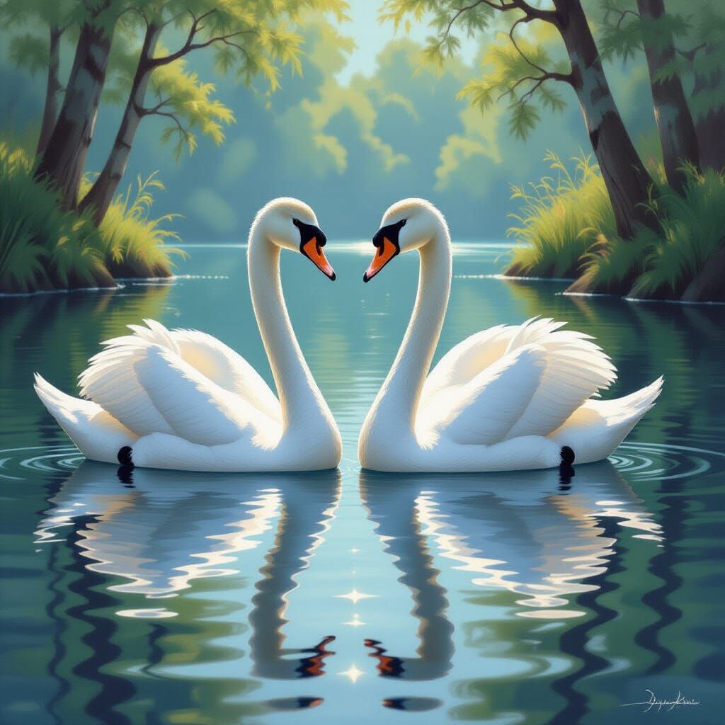 This image shows a pair of elegant swans with gleaming white feathers and bright black eyes, mirrored on a tranquil lake. The artwork is in a realistic style with precise details and soft lighting.