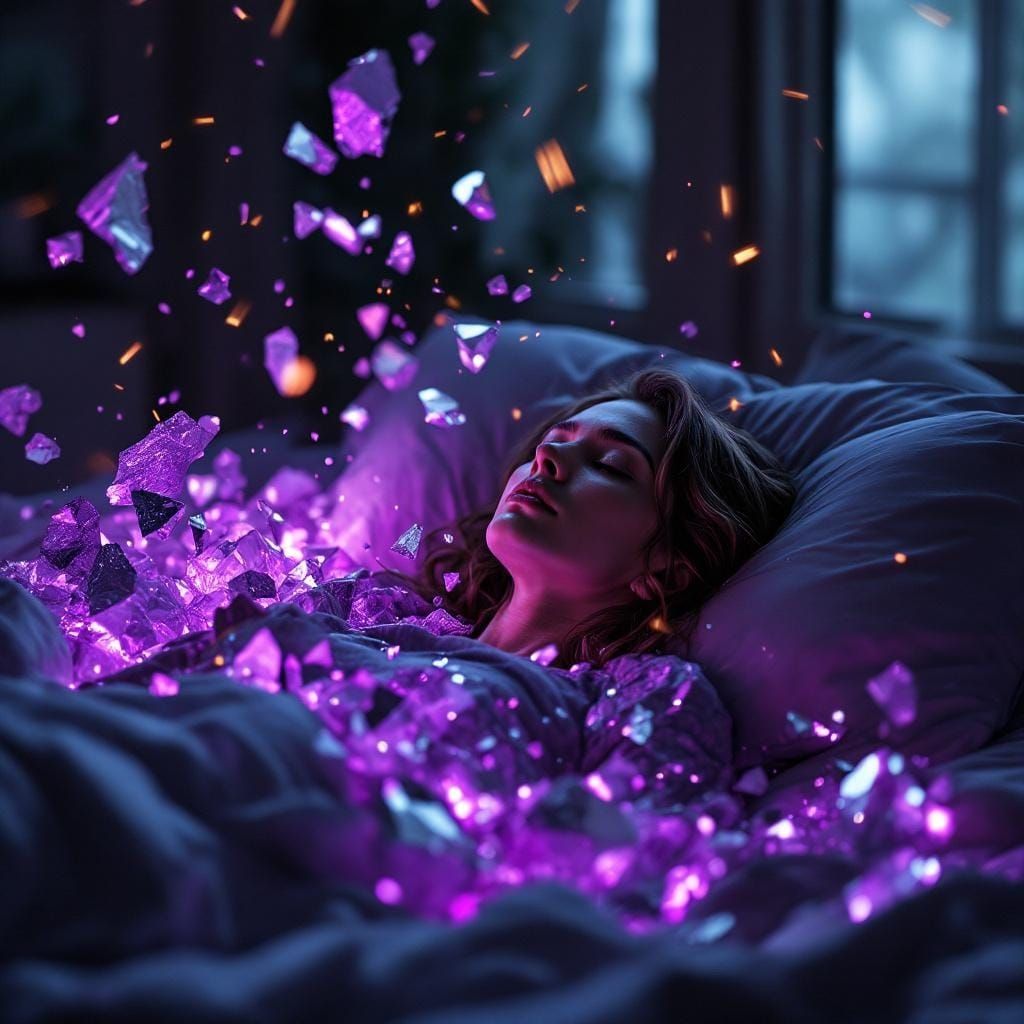 The husband brings a tray to the bedroom, silver crystalline shards of dishes floating midair as if too heavy to hold. The woman lies in chiaroscuro rim light, surrounded by fractured violet shards that glow softly around her. Ember sparks drift upward, painterly surreal textures merging tenderness and exhaustion, ultra-detailed cinematic rendering of caregiving love made fragile.