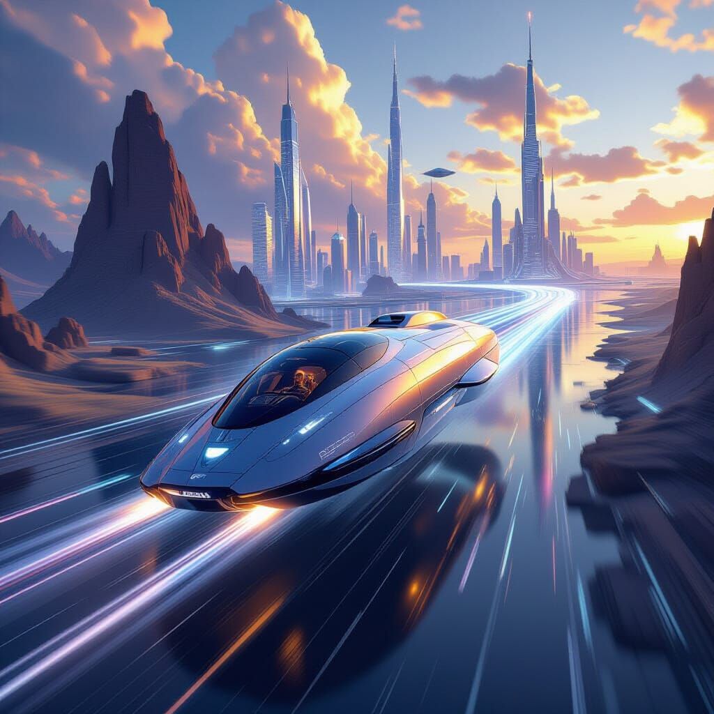 This image shows a unique time-traveling vessel journeying through diverse historical epochs, from ancient landscapes to futuristic cities, depicted in a dynamic, cinematic digital art style.
