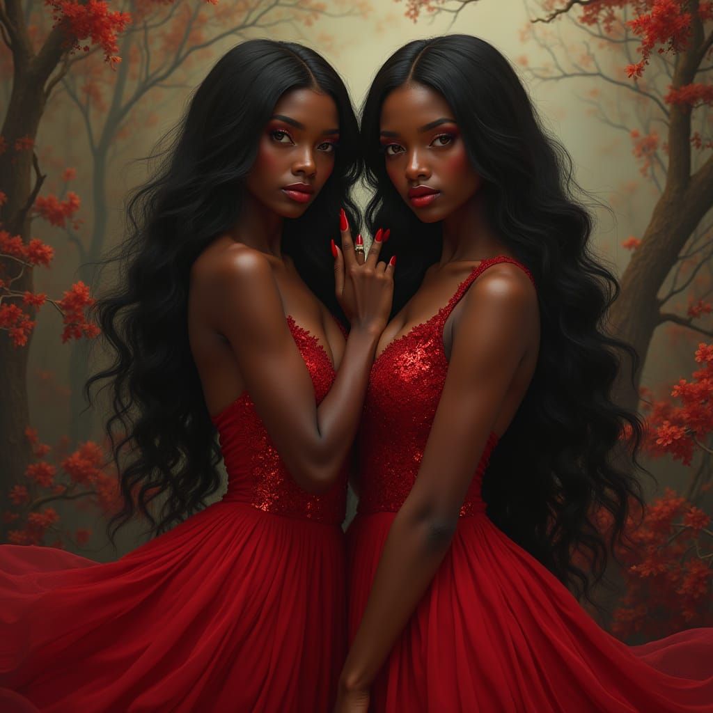This image depicts two beautiful black sisters in flowing evening gowns, adorned with lace and subtle sparkle, posing with long stiletto nails in a whimsical, dreamlike atmosphere, reminiscent of vibrant fantasy worlds with intricate detail and rich textures.