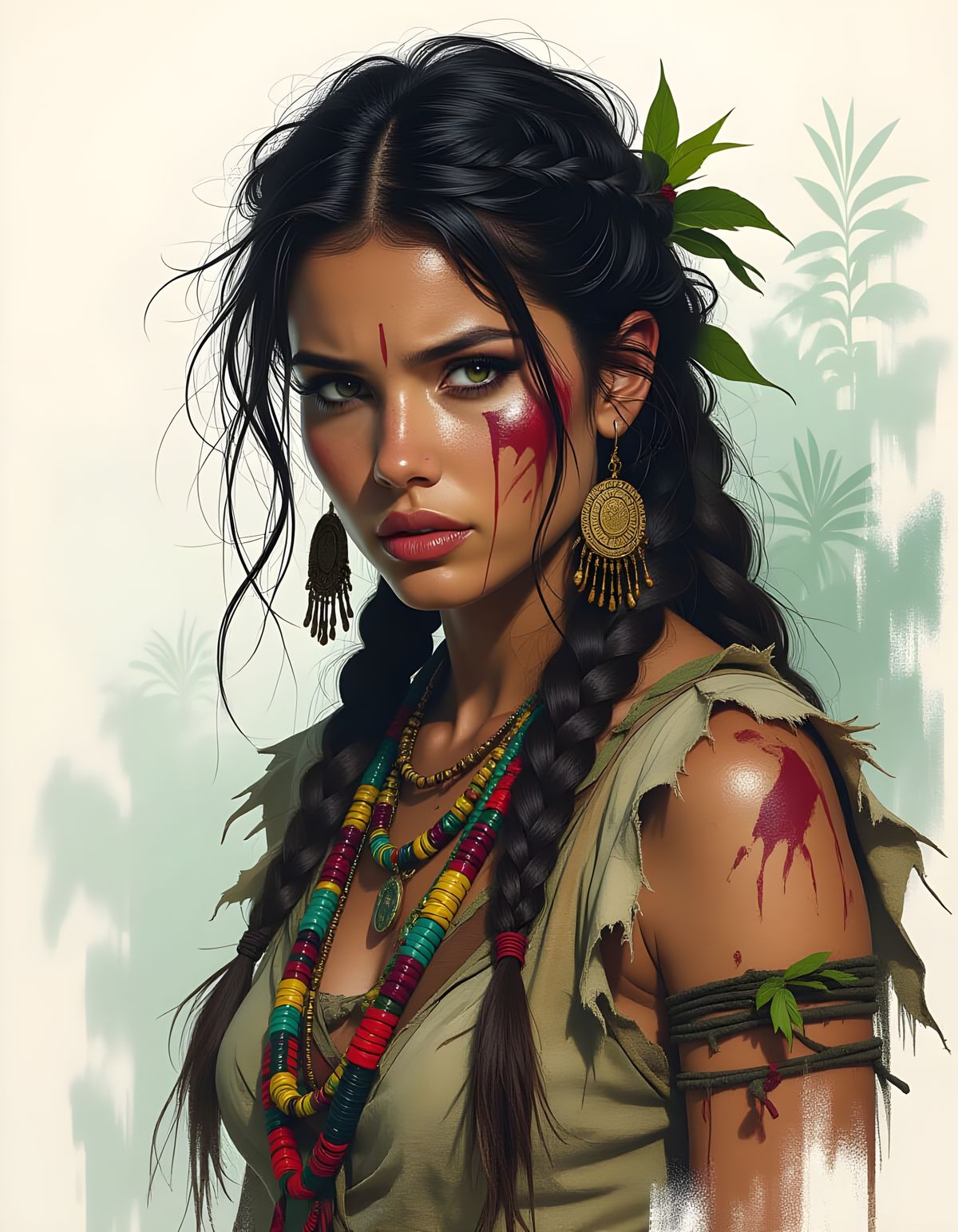 A dramatic portrait of a tribal woman with an agonized expression, set against a misty jungle backdrop. The image features dark, verdant colors and intricate details, reminiscent of vintage poster art.