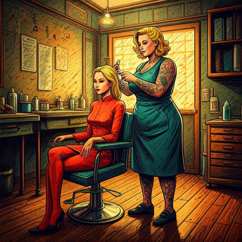 This image captures a lively scene of a young blonde woman getting a haircut in a vintage hairdressing salon, with a tattooed hairdresser behind her. The artwork is reminiscent of 1970s European comic art, with intricate details and a blend of ink and paint techniques.