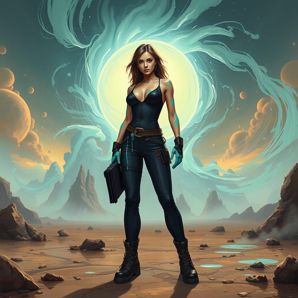 A futuristic scout fearlessly explores a mystical frontier. The bare-chested woman, in a sleek jumpsuit, is splattered with aqua slime in this blend of futuristic and organic elements.