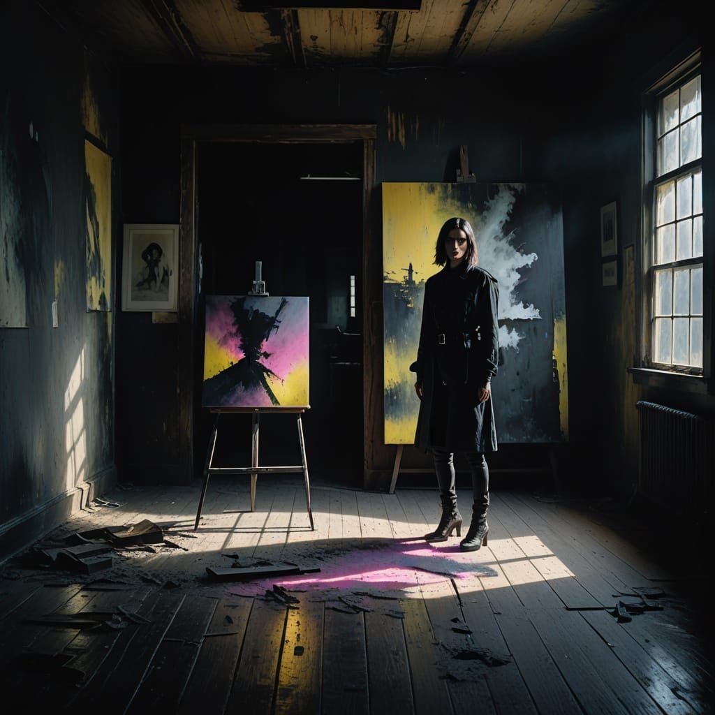 This image is a moody, high-contrast scene of a goth fashion model in a neon-lit coffee shop, surrounded by fog and smoke, with a rich, atmospheric perspective and bold brushstrokes, evoking the style of Expressionist painting.