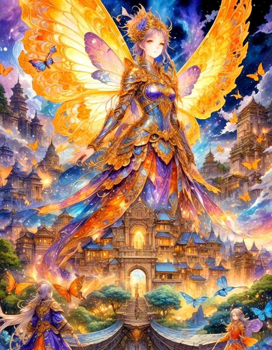 This image features a beautiful fairy knight in amethyst armor with butterfly wings, set against an ancient, magical city with an ethereal aura. Rendered in a vibrant, colorful manga-inspired style with detailed line art and watercolor elements.