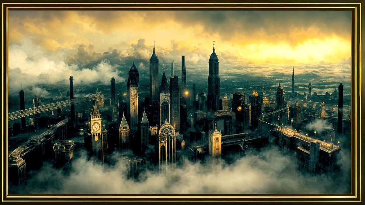A high-angle view of a fog-covered city with a mysterious floating door guarded by steampunk cockatoos. Features vibrant, ethereal colors and textured impasto style.