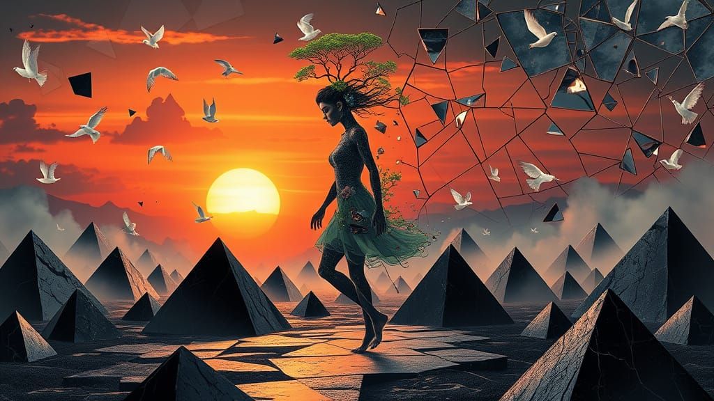 A surreal image of a woman made of tools and plants walking on black and white pyramids. Her body is an ecosystem beneath a sky of shattered mirrors reflecting dreamlike visions. A collage of folklore creatures in a natural landscape.
