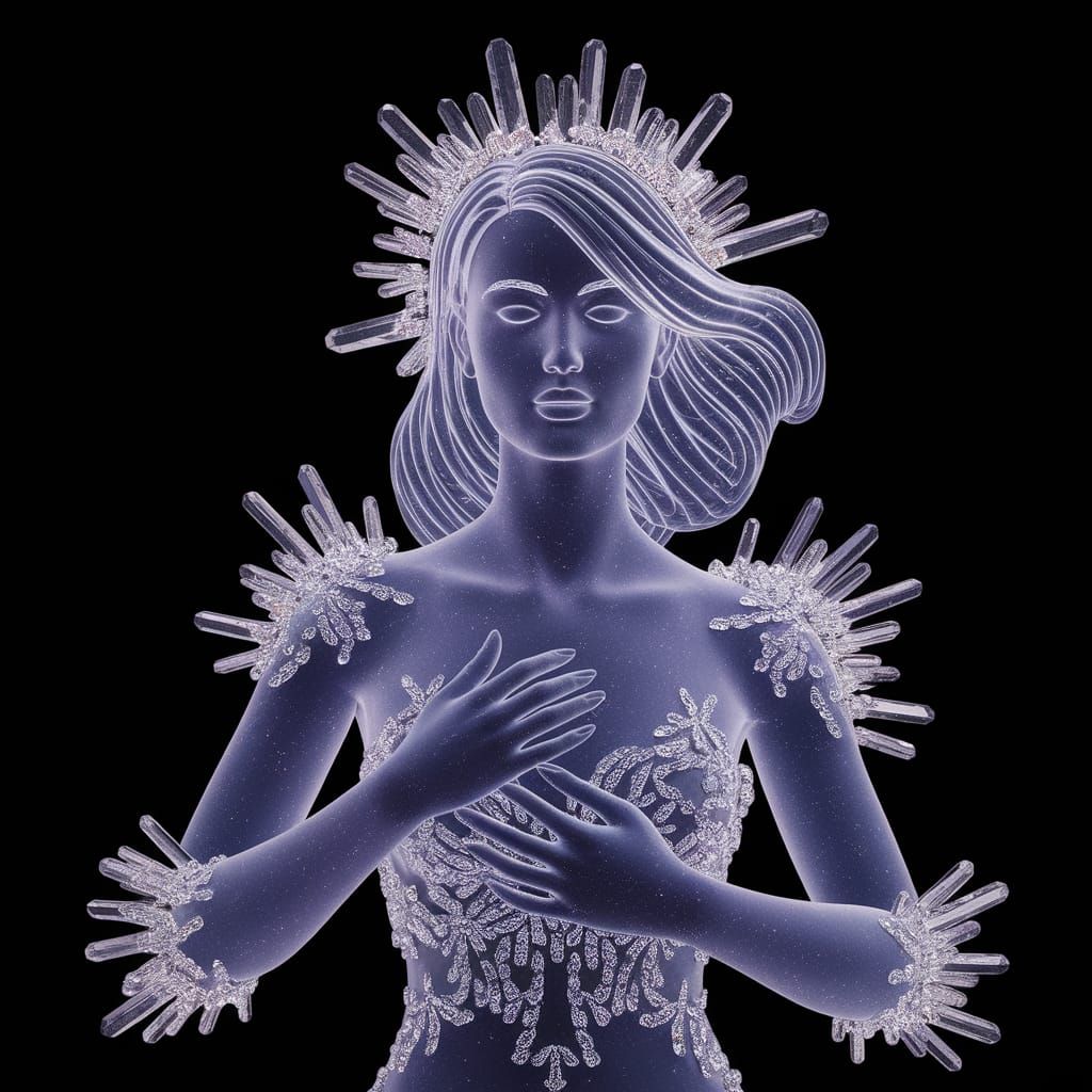 This image depicts a woman whose body is formed entirely of crystal. The rendering captures the intricate details of the crystalline structure.