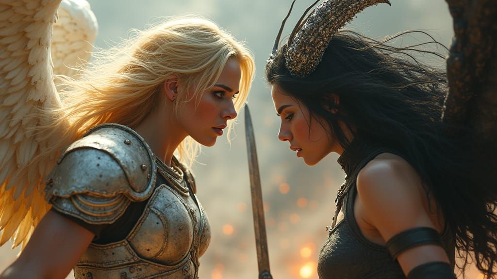 This image depicts a dramatic clash between a blonde warrior angel and a dark female demon, set amidst a chaotic battlefield, with intricate details and hyper-realistic textures reminiscent of a Hollywood blockbuster.