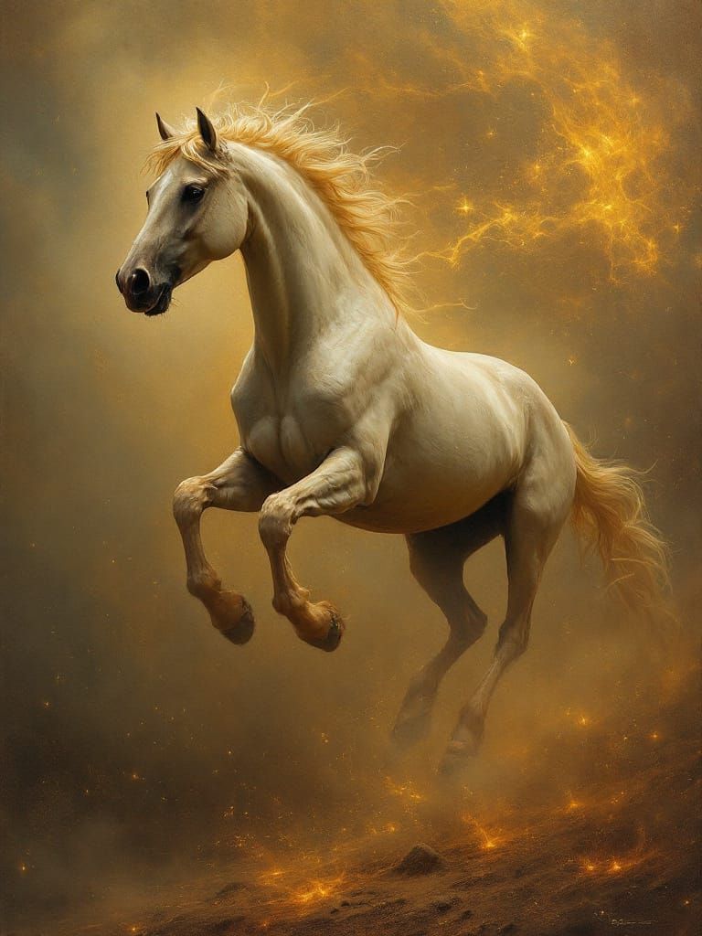 This image captures a horse with a blonde mane soaring through luminous, golden clouds, with a warm glow from below. The artwork blends dramatic lighting with dreamlike precision, evoking a sense of timeless enchantment.