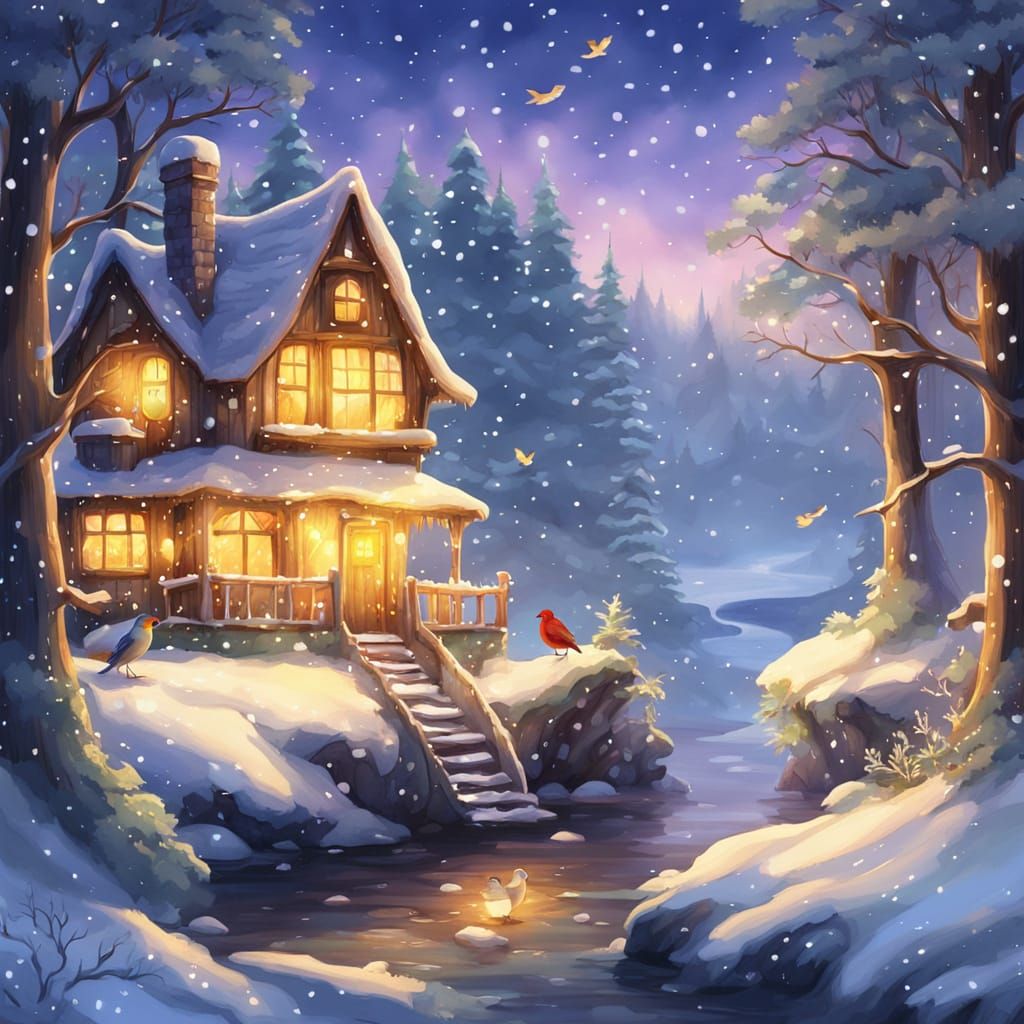 This image shows a cottage in a snow-covered forest, depicted in a watercolor style. The scene includes fantasy birds, a river, and softly glowing windows, all illuminated with warm golden lighting.