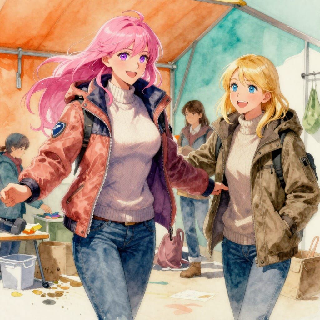 This image shows two smiling women in winter attire assisting each other at a shelter. Rendered in a watercolor style with dynamic lighting and intricate detail.