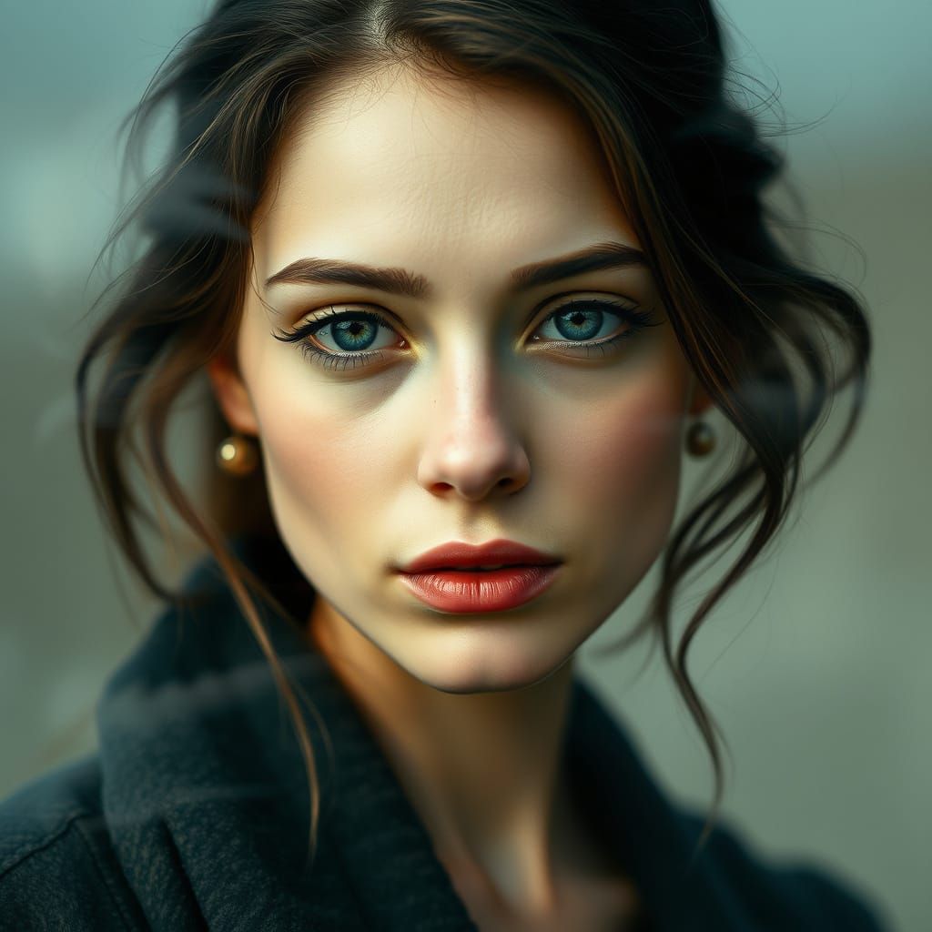 This image combines photorealistic detail with impressionistic style, blending two realities into one in a captivating visual paradox. A woman's face is sharp and defined, while her surroundings are blurred, evoking mystery and intrigue.