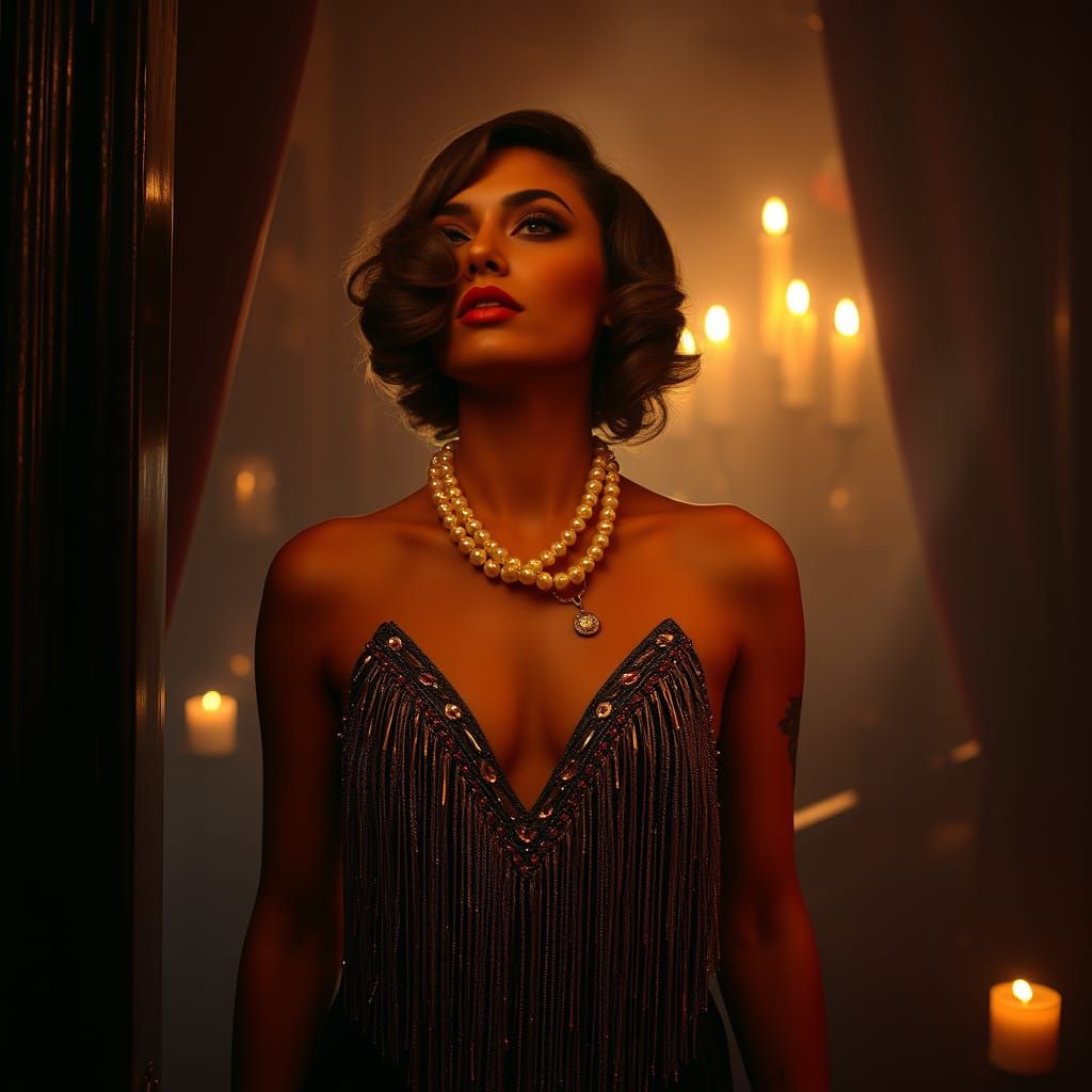 A flapper singer in a beaded dress emerges from shadows in a smoky lounge, illuminated by candlelight. The image evokes art nouveau with dramatic lighting and luxurious textures.