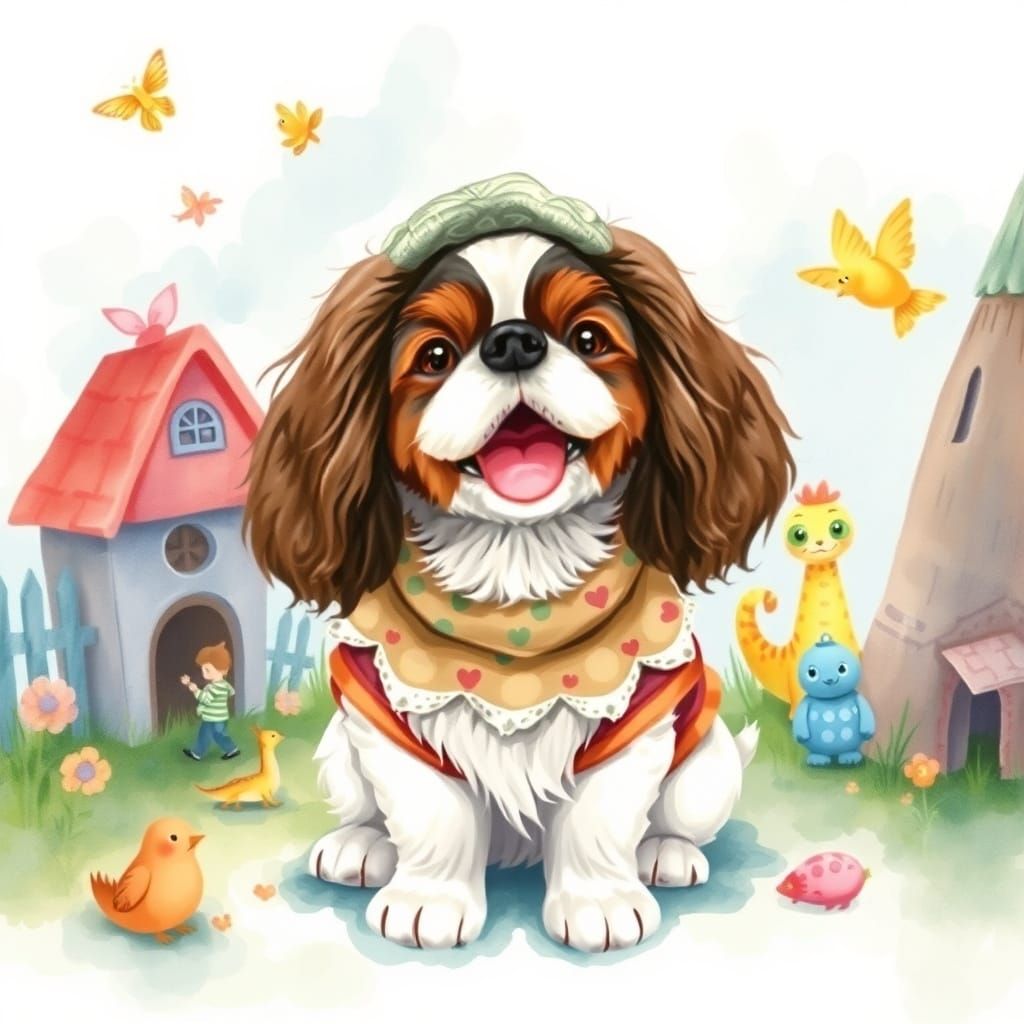 This charming watercolor illustration features a Cavalier King Charles Spaniel surrounded by fantastical creatures in a playful, heartwarming scene, filled with cheerful details and imaginative elements.