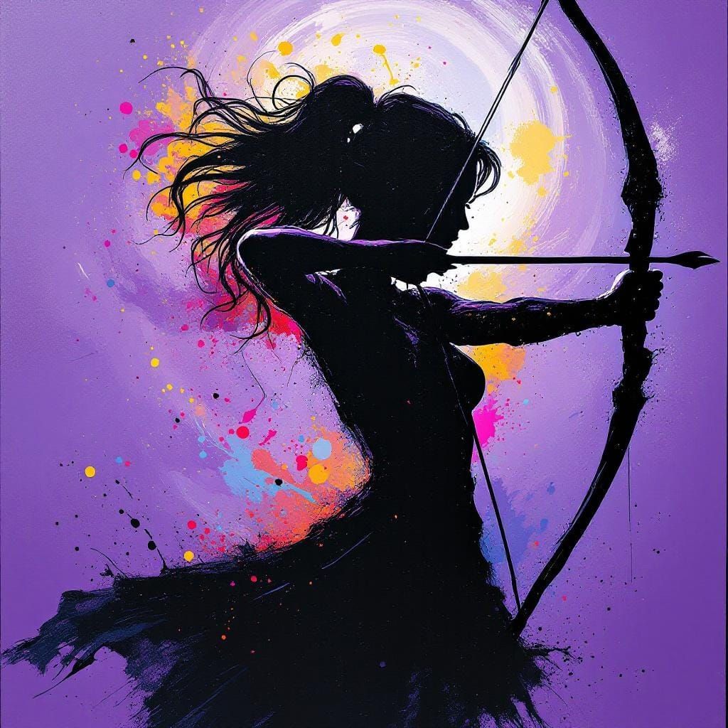 This image shows a silhouetted woman drawing back a bow and arrow against a purple backdrop. The artwork is rendered in a colorful, high-contrast graffiti style.