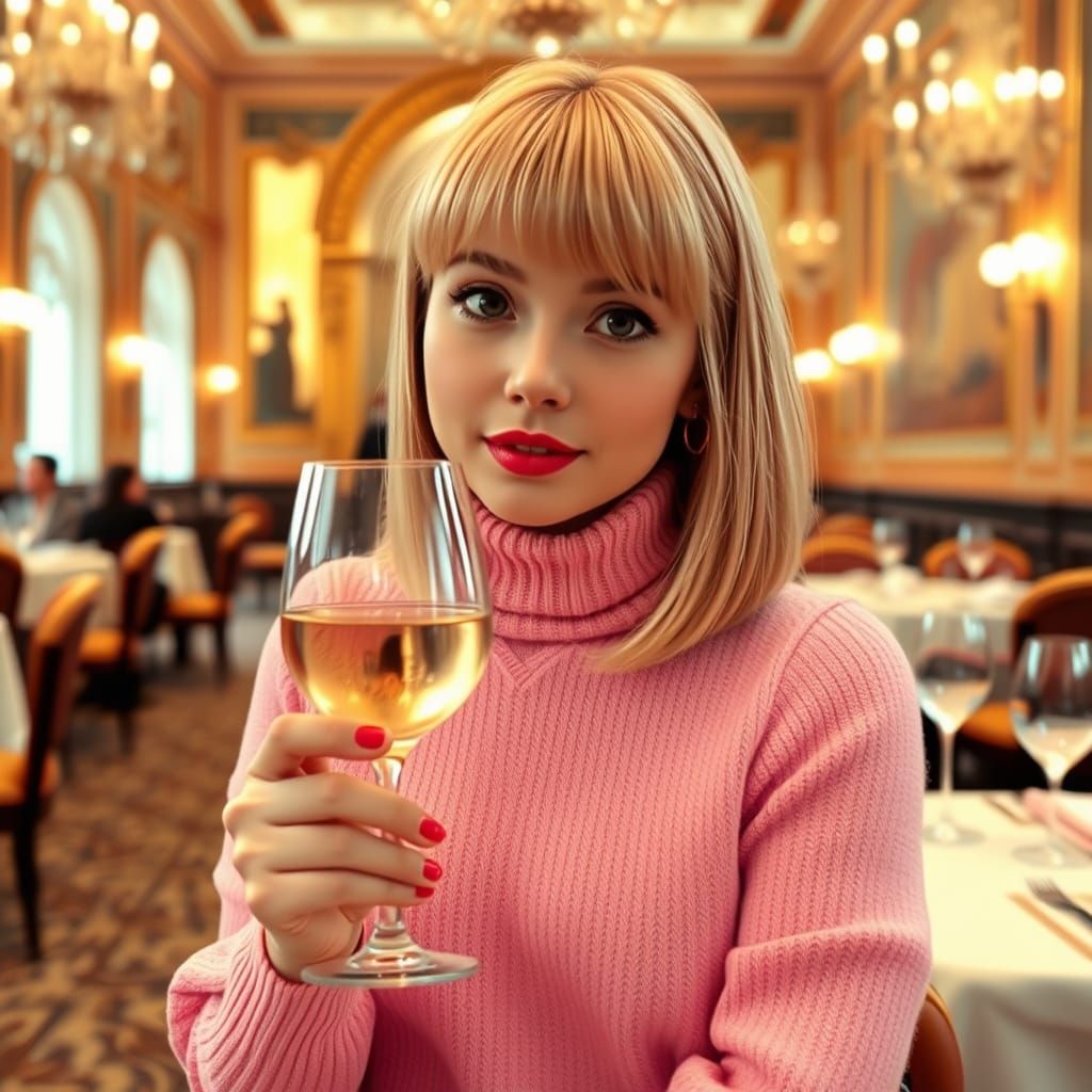 A delicate painting of a young woman in a cozy restaurant setting, surrounded by lush decor and vibrant colors, exuding a sense of sweet romance and shy charm
