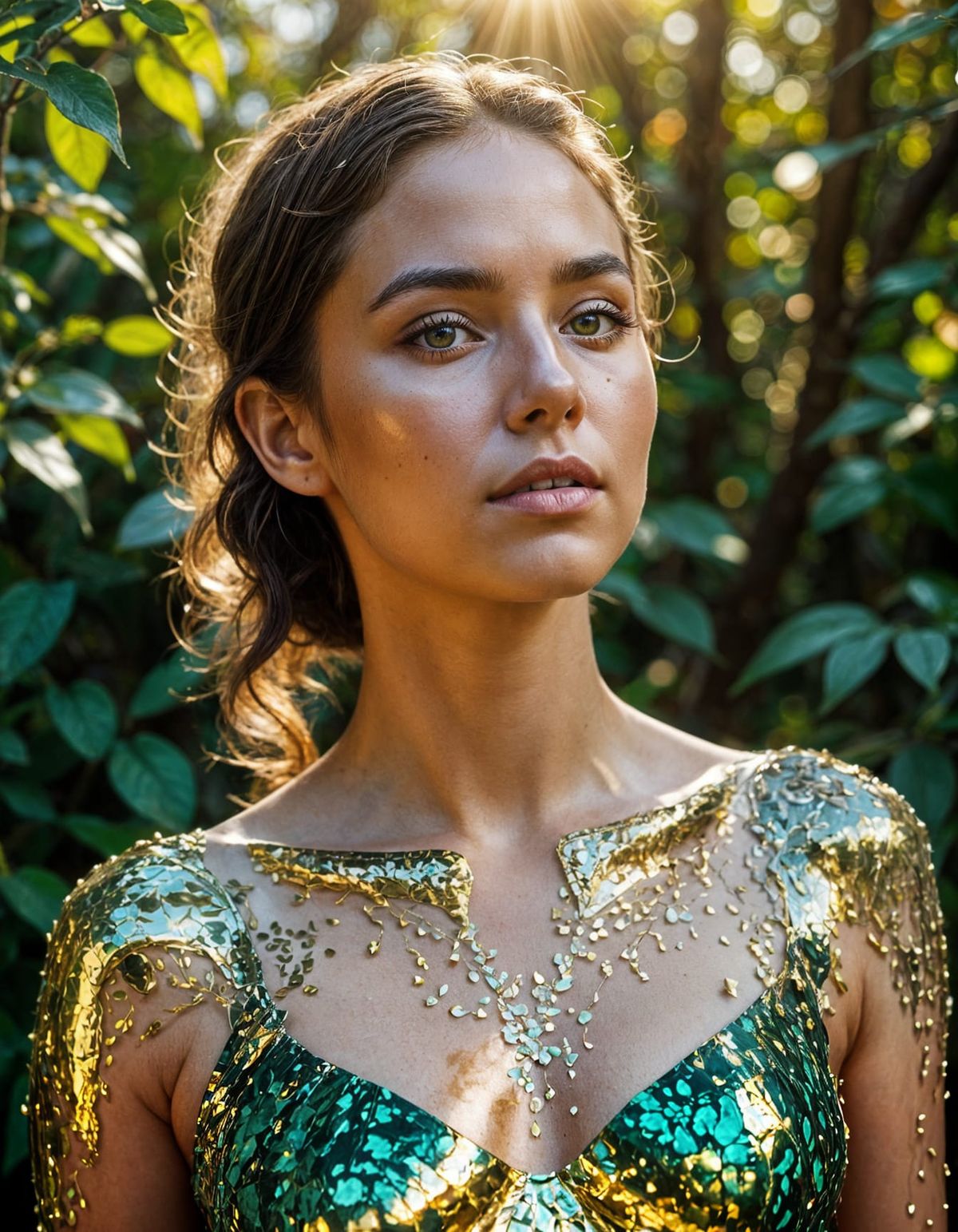 A portrait of a young woman with a striking two-tone pixie cut, bathed in golden sunlight. Her skin is decorated with shimmering, iridescent body paint in a Klimt-inspired style.