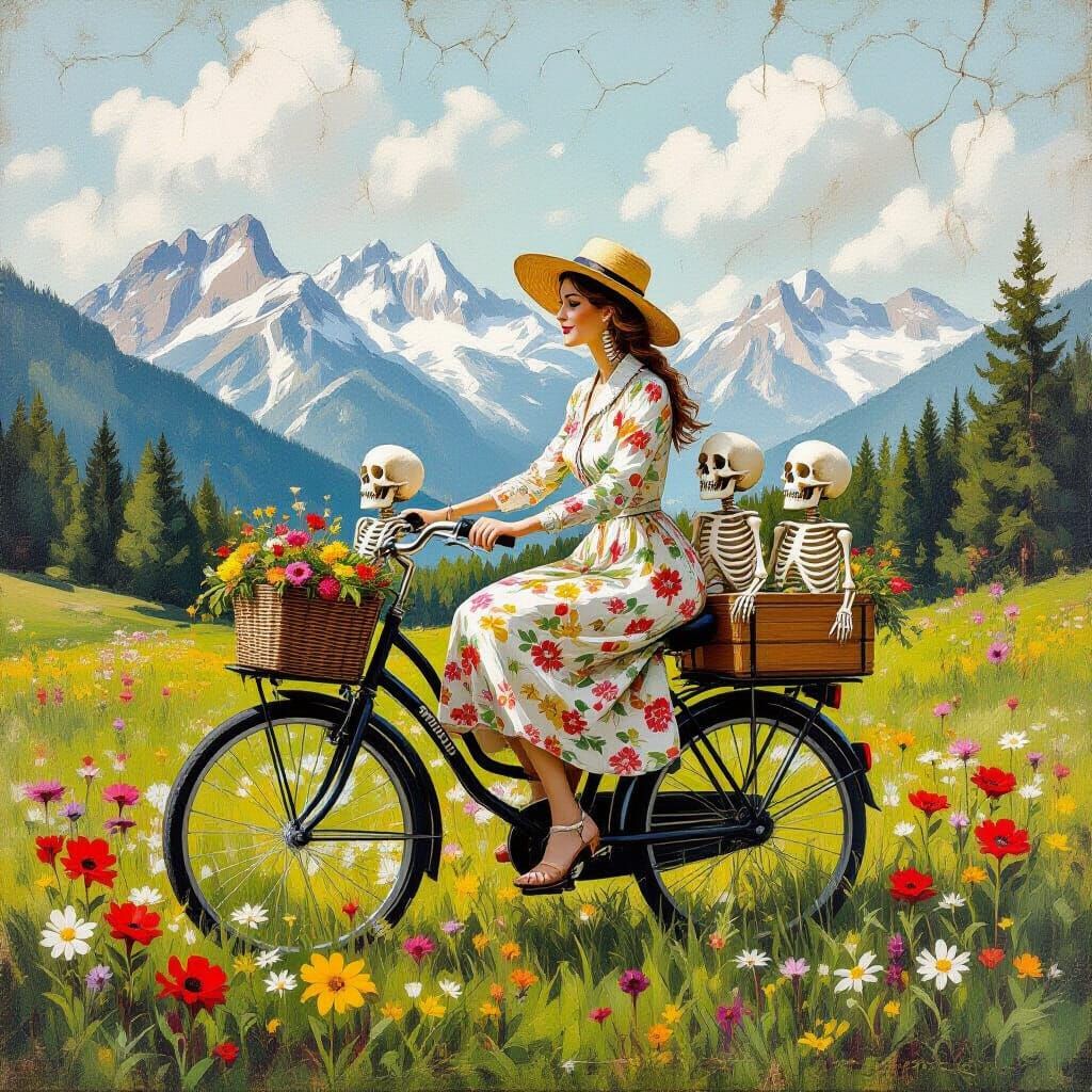 A striking picture of a mother and her skeleton children in a cargo bike, set amongst mountains and wildflowers. The old painting uses heavy brushstrokes and a cracked texture.