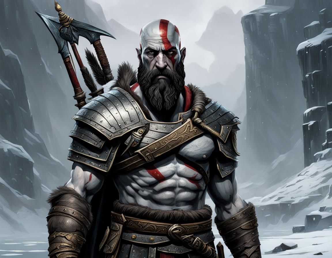A somber image of the God of War amidst a frozen landscape. The picture captures a stoic and melancholic mood, reflecting the harshness of the icy environment.